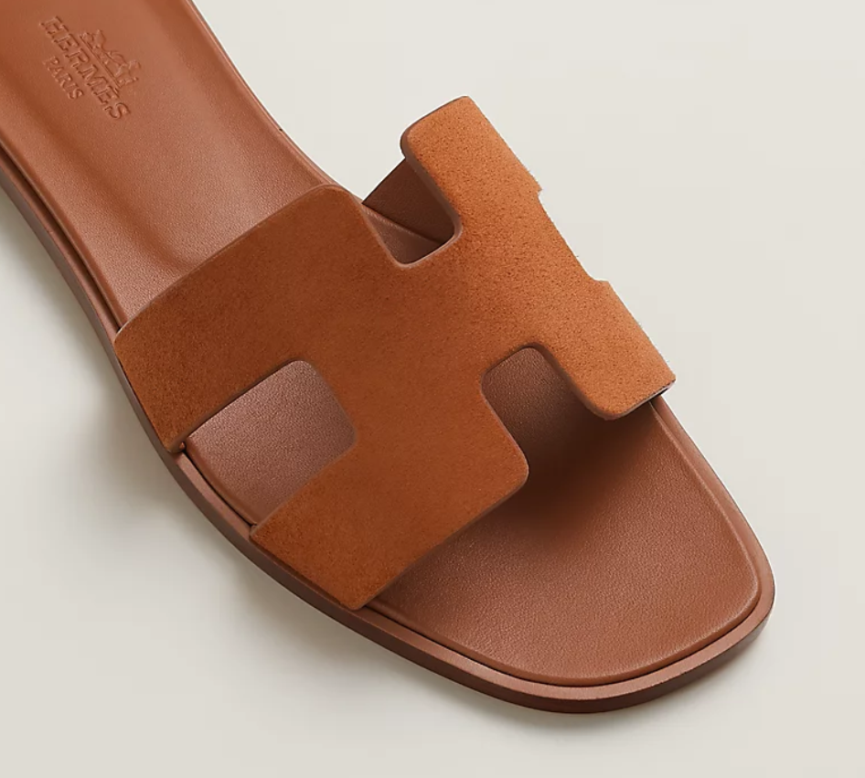 - 마지막으로 소개해 드릴 제품은 에르메스 ORAN 샌들입니다. 언제 어디서나 편하게 신고 다닐 수 있는 플랫 형태의 샌들인데요. 사진만 보더라도 에르메스의 제품인 것을 바로 알 수 있는 아이코닉한 에르메스만의 로고모양이 상단에 자리하고 있습니다. ORAN 제품은 참고로 두 개의 교차하는 가죽 스트랩이 시그니처라고 할 수 있습니다.