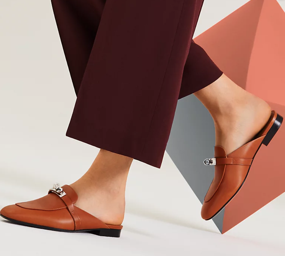 - 다음으로 소개해 드릴 제품은 뮬입니다. 신발처럼 생겼지만 뒷부분은 슬리퍼처럼 트여있어서 신고 벗기가 간편해 간단히 신을 수 있는 신발로 인기가 굉장히 많은 뮬인데요. 에르메스의 우아하고 깔끔한 Oz 뮬은 특히 고급스럽고 세련된 디자인으로 많은 사람들에게 인기가 있는 신발입니다.