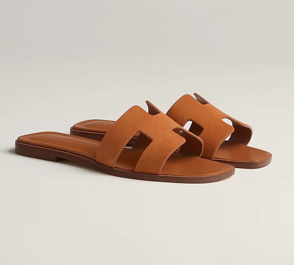 - 마지막으로 소개해 드릴 제품은 에르메스 ORAN 샌들입니다. 언제 어디서나 편하게 신고 다닐 수 있는 플랫 형태의 샌들인데요. 사진만 보더라도 에르메스의 제품인 것을 바로 알 수 있는 아이코닉한 에르메스만의 로고모양이 상단에 자리하고 있습니다. ORAN 제품은 참고로 두 개의 교차하는 가죽 스트랩이 시그니처라고 할 수 있습니다.
