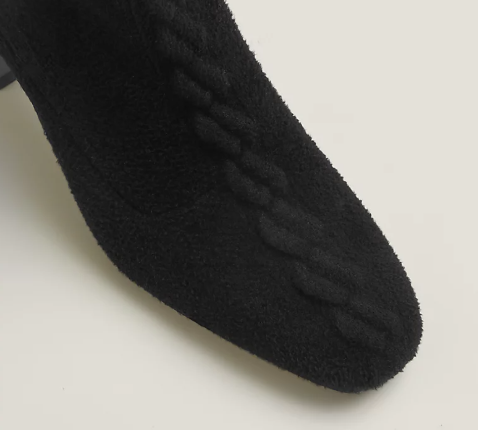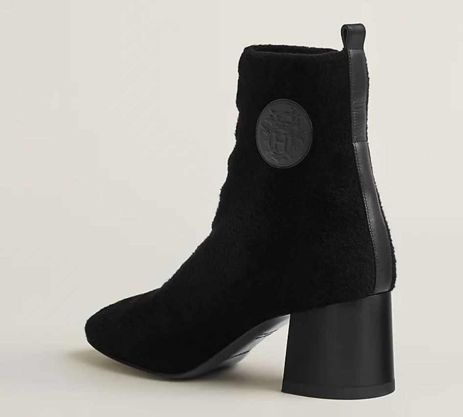 - 다음으로 소개해 드릴 제품은 에르메스 Volver 60 앵클부츠입니다. 보기만 해도 섹시함이 느껴지는 부츠인데요. 실제로 날렵한 쉐입과 이쁜 라인이 부츠를 더욱 도드라지게 만들어줍니다. 볼베르 블랙의 시크함을 제대로 느낄 수 있는 부츠인데요. 세부적으로 소재를 살펴보면 솔과 힐은 블랙 가죽, 인솔은 블랙 고트스킨, 안감은 블랙 테크니컬 캔버스로 되어 있습니다. 사진상으로 봤을 때는 굽이 상당히 있어 보여 불편한 것 아닌가 생각이 드실 수도 있는데 실제 굽은 6cm로 편하게 신으실 수 있습니다.