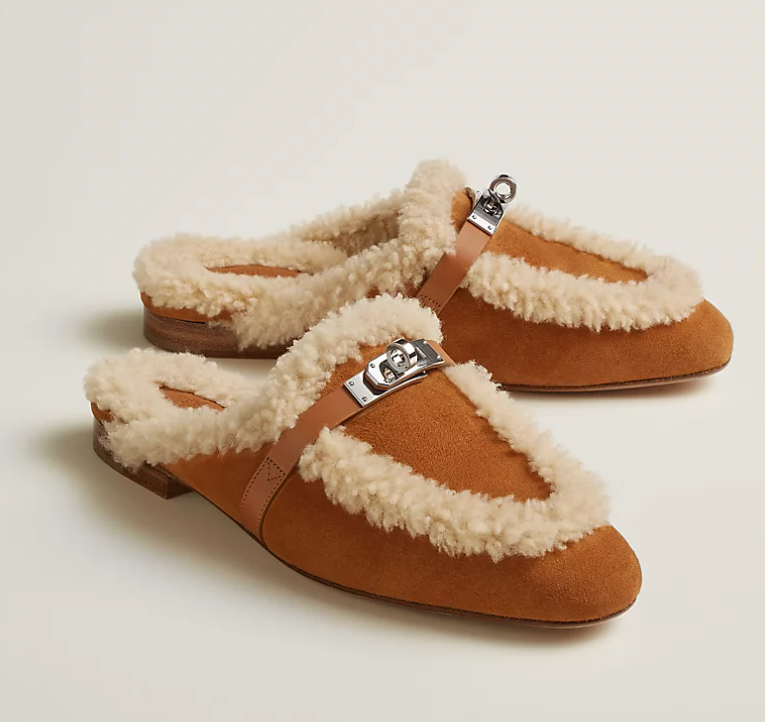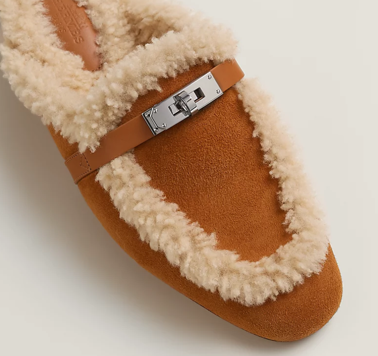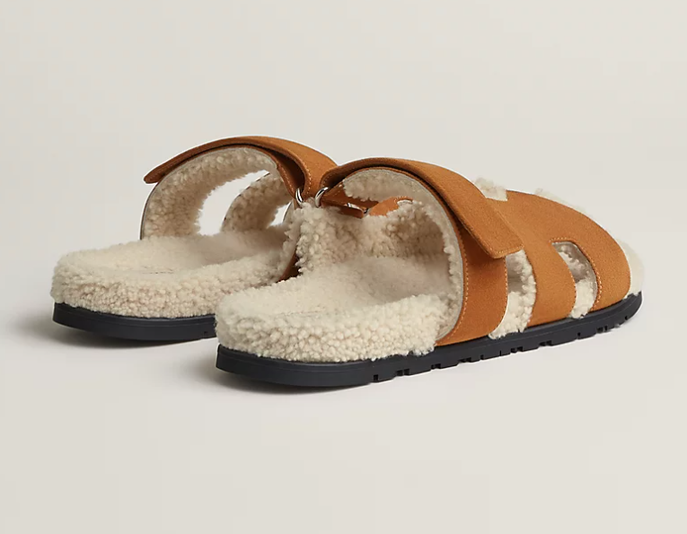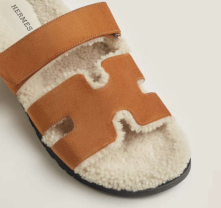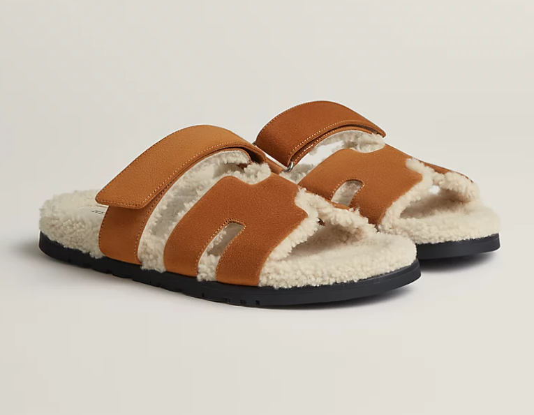 - 두 번째로 살펴볼 제품은 에르메스의 시프레(CHYPRE)입니다. 에르메스 특유의 장인 정신을 엿볼 수 있는 가죽이 아주 짱짱한 형태로 디자인된 슬리퍼인데요. 이번에는 겨울 시즌을 맞아 약간 어그부츠 UGG 느낌이 나는 버전으로 새로 출시되었습니다.
