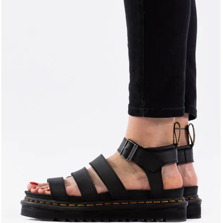 - 상기 사진에 나와있는 샌들은 닥터마틴의 베스트셀러인 '블레어 샌들'입니다. 블레어는 일단 제품이 워낙 가벼워서 부담 없이 신기에도 좋고 위에서 말씀드린 것처럼 내구성이 아주 좋아 오랫동안 신을 수 있는 장점이 있습니다. 디자인도 타 샌들처럼 튀지 않고 무난하기 때문에 어떤 옷이나 바지에도 매칭하기가 아주 쉽구요. 굽이 상당히 있는 편이기 때문에 키가 작은 여성분들이 많이 선호하시는 것 같습니다. 한국은 곧 장마철에 접어드는데요. 바닥이 미끄럽지 않고 딱 고정해주기 때문에 비 오는 날에도 부담없이 신기 좋습니다.