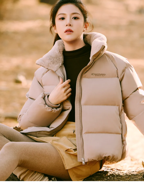 - 첫 번째로 살펴볼 제품은 디스커버리익스페디션의 여성 올리브 RDS 숏패딩입니다. 하이넥형 숏패딩으로 사진에서 보시는 것처럼 목부분에 따뜻한 에코퍼가 있기 때문에 추운 날씨에도 보온성이 좋은 숏패딩인데요. 캐주얼하고 편안하기 때문에 데일리용으로 부담 없이 입기 좋은 숏패딩입니다. 사진에서 보시는것처럼 트레이닝복이나 치마에도 너무 잘 어울리고요. 겨울철 입는 면바지나 청바지에도 잘 어울리는 패딩입니다.