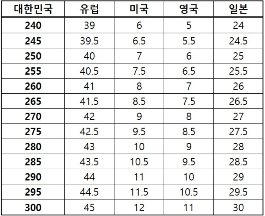 2. 해외 국내 국가별 신발 사이즈표 비교 정리 총 정리