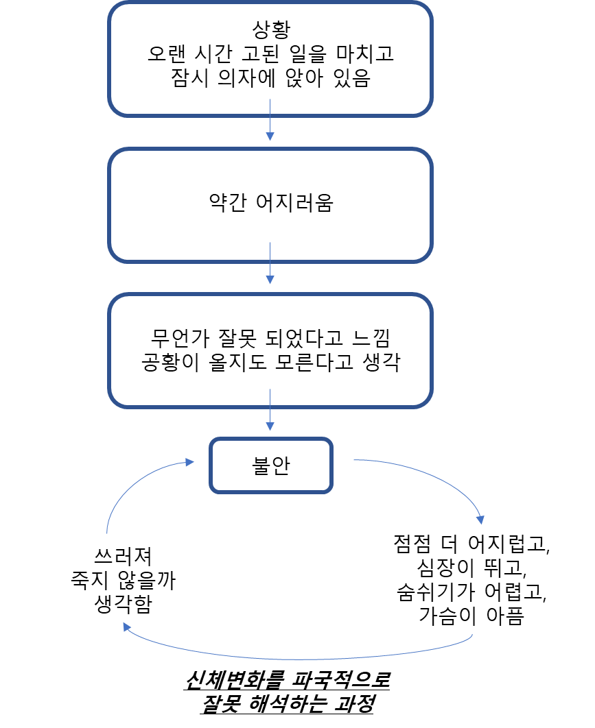 - 추가적인 공황발작이나 그에 대한 결과(ex. 통제를 잃음, 심장발작을 일으킴, 미치는 것)에 대한 지속적인 걱정