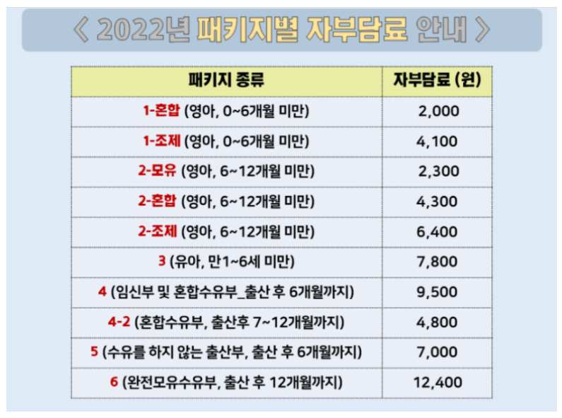 - 영양플러스 사업은 전액 무료는 아닙니다. 자부담 비용이 따로 있는데요. 각 시,군,구 보건소마다 상이하지만 대략적으로 자부담 비용은 10% 정도 됩니다. 다만 기준 중위소득 65% 미만이거나 기초 생활 수급가구, 차상위계층은 전액 무료로 진행됩니다. 2022년 패키지별 자부담료 안내에 대해 참고하시라고 표를 첨부해 드립니다.