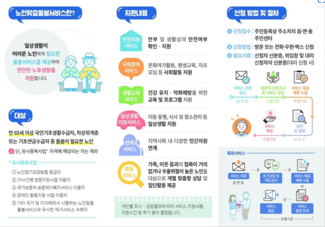 - 만 65세 이상 국민기초생활 수급자, 차상위계층 또는 기초연금수급자 중 돌봄이 필요한 노인