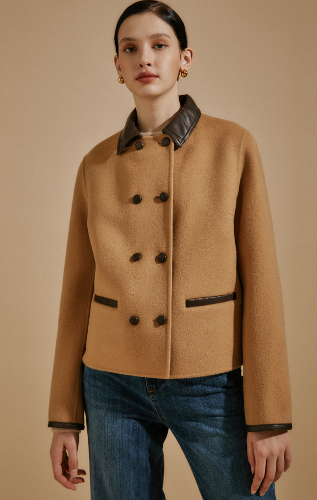 - 네번째로 소개해 드릴 제품은 래더 패치 캐시미어 코트입니다. 더블 버튼 디자인의 가죽 배색을 포인트로 주어 스타일리시하고 캐주얼한 느낌을 완성한 숏 기장의 코트입니다. 울과 캐시미어 혼방으로 소재가 굉장히 부드러워 고급스러운 착용감을 느낄 수 있고요. 워낙 클래식한 느낌을 가지고 있어 직장 뿐만 아니라 데일리용으로 입어도 너무 이쁜 코트입니다.