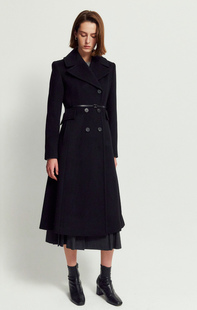 - 가장 큰 특징이라고 한다면 역시나 소재인데요. 울과 캐시미어 혼방으로 지금처럼 날이 추울 때 입기 정말 좋은 코트이구요. 소재로 인해 고급스러운 느낌이 나는 재킷입니다. 허리에는 탈착이 가능한 벨트 스트랩이 있어 조였다 풀었다 하면서 내가 핏을 조절할 수 있는 것이 장점이고요. 이렇게 벨트 스트랩으로 인해 여성스럽고 우아한 실루엣을 연출할 수 있습니다. 롱코트의 정석이라고 할 수 있는 제품입니다.