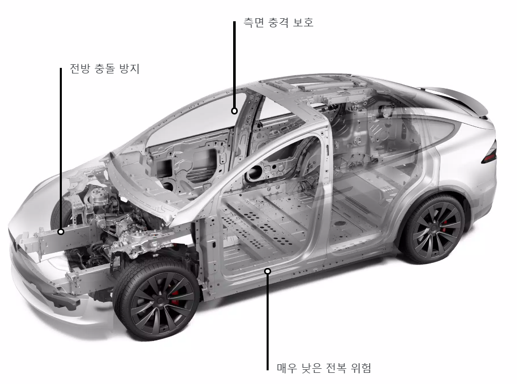 - 위 그림에서 알 수 있듯이 테슬라 모델X는 애초에 설계부터 전방 충돌 방지, 측면 충격 보호, 낮은 전복 위험 등을 고려하여 설계되었습니다. 개발 단계부터 전기차로 설계되어 견고한 구조와 차체 하부에 장착된 배터리팩으로 탑승자 상해 확률을 줄여주고 차량 전복 위험을 최대한 낮출 수 있도록 설계되어있습니다. 또한 모든 모델X는 테슬라의 최신 액티브 세이프티 기능인 자동 긴급 제동 등이 기본 사양으로 들어가 있습니다.