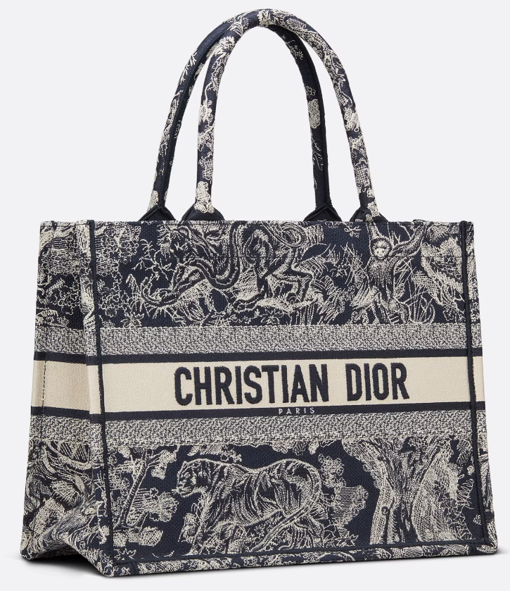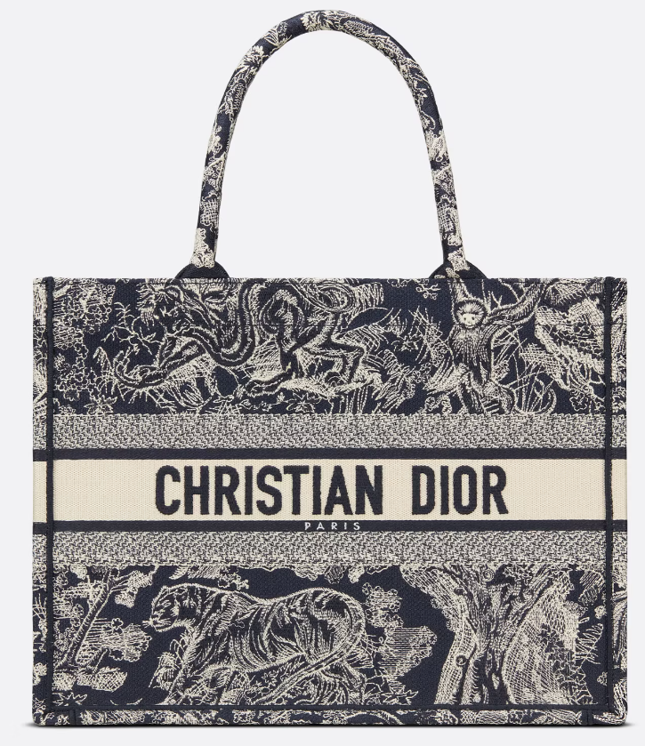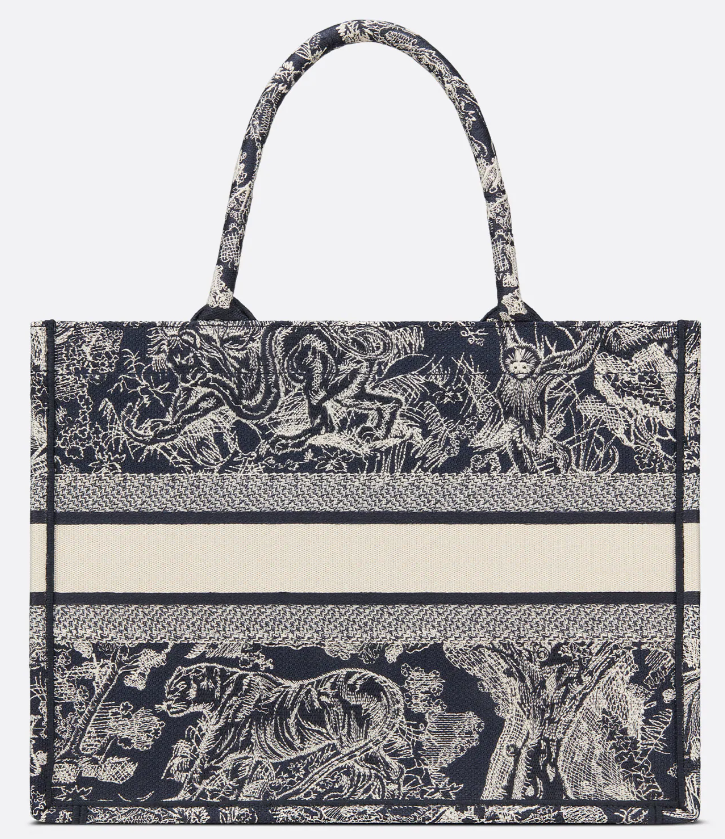 - 토트백은 캔버스 재질이라 가격대가 저렴한 편이라고 했지만 디올의 북토트백은 가격대가 어느 정도 있는 편입니다. 그 이유는 앞서 말씀드린 아트 디렉터 마리아 그라치아 치우리의 시그니처 패턴과 디올 하우스의 홀마크 패턴을 반전된 컬러로 재해석한 블루와 에크루 컬러 모티브의 자수, 가방 속에 들어 있는 더스트백, 사이즈 등등 기타 가방과 차별화를 두었기 때문입니다.