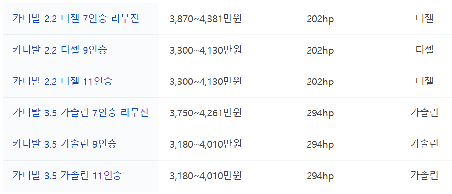 - 카니발의 가격은 가솔린인지 디젤인지, 몇 인승인지, 리무진인지 아닌지에 따라 가격이 모두 다른데 트림별 가격을 하기와 같이 정리해 놓았습니다.