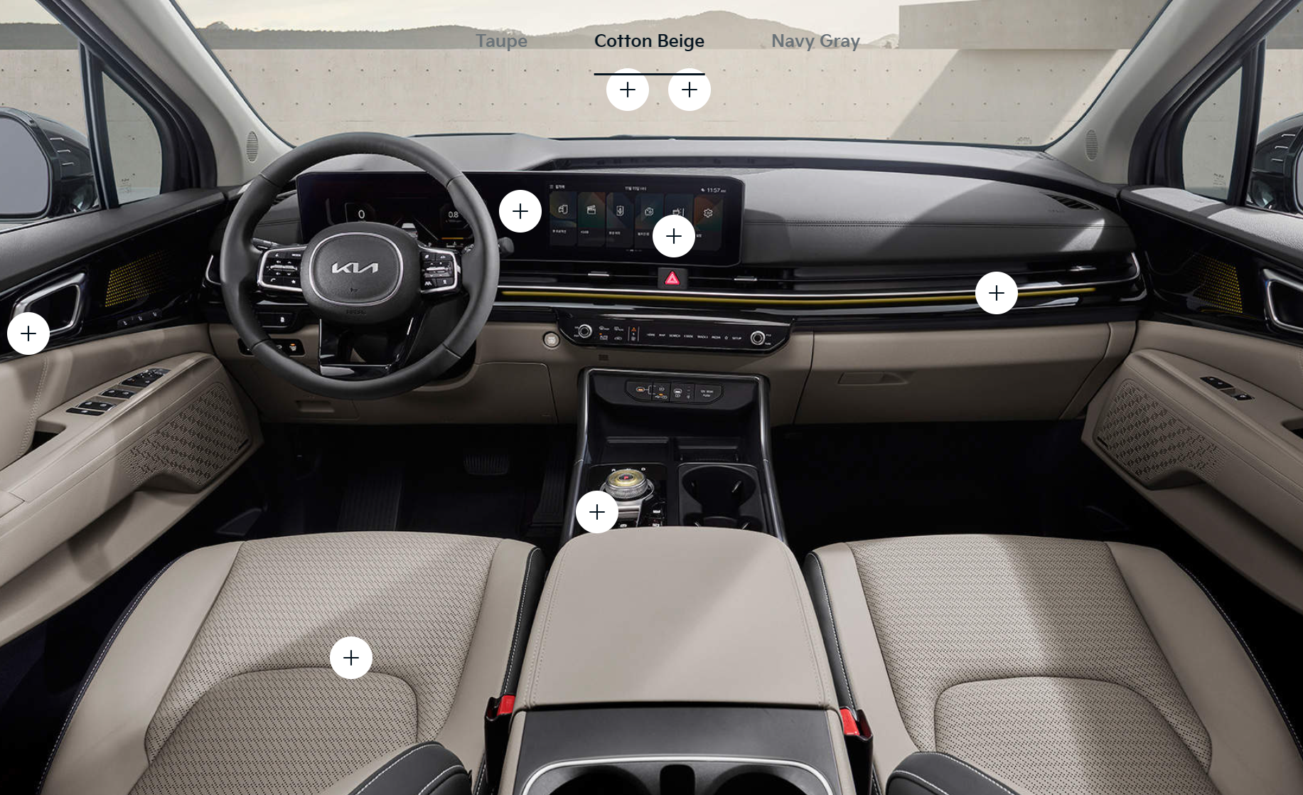- 다음으로는 실내의 변경입니다. 상기 사진은 제가 기아 홈페이지에서 발췌한 실내의 색상 종류인데요. Taupe, Cotton Beige, Navy Gray로 너무나 이쁜 질감과 색상으로 인테리어 되었습니다.