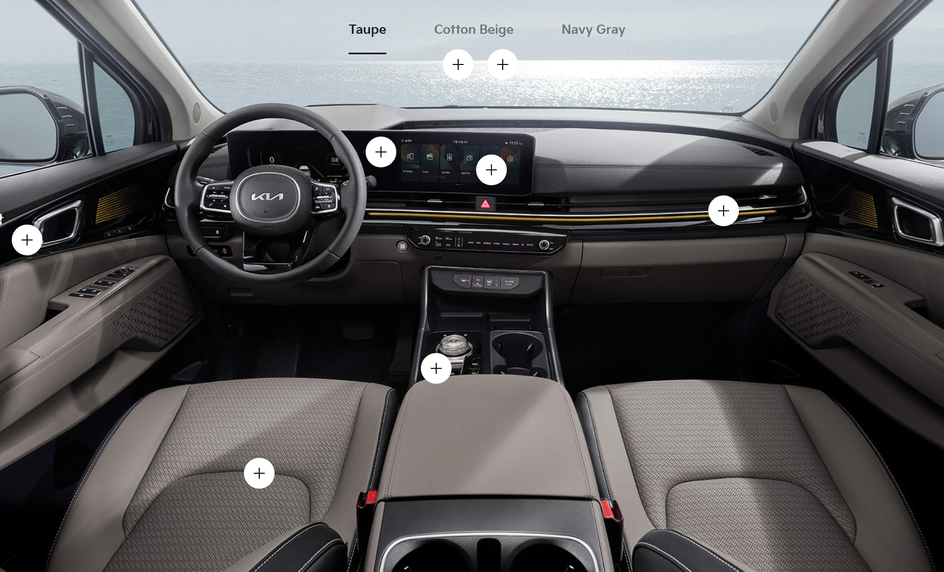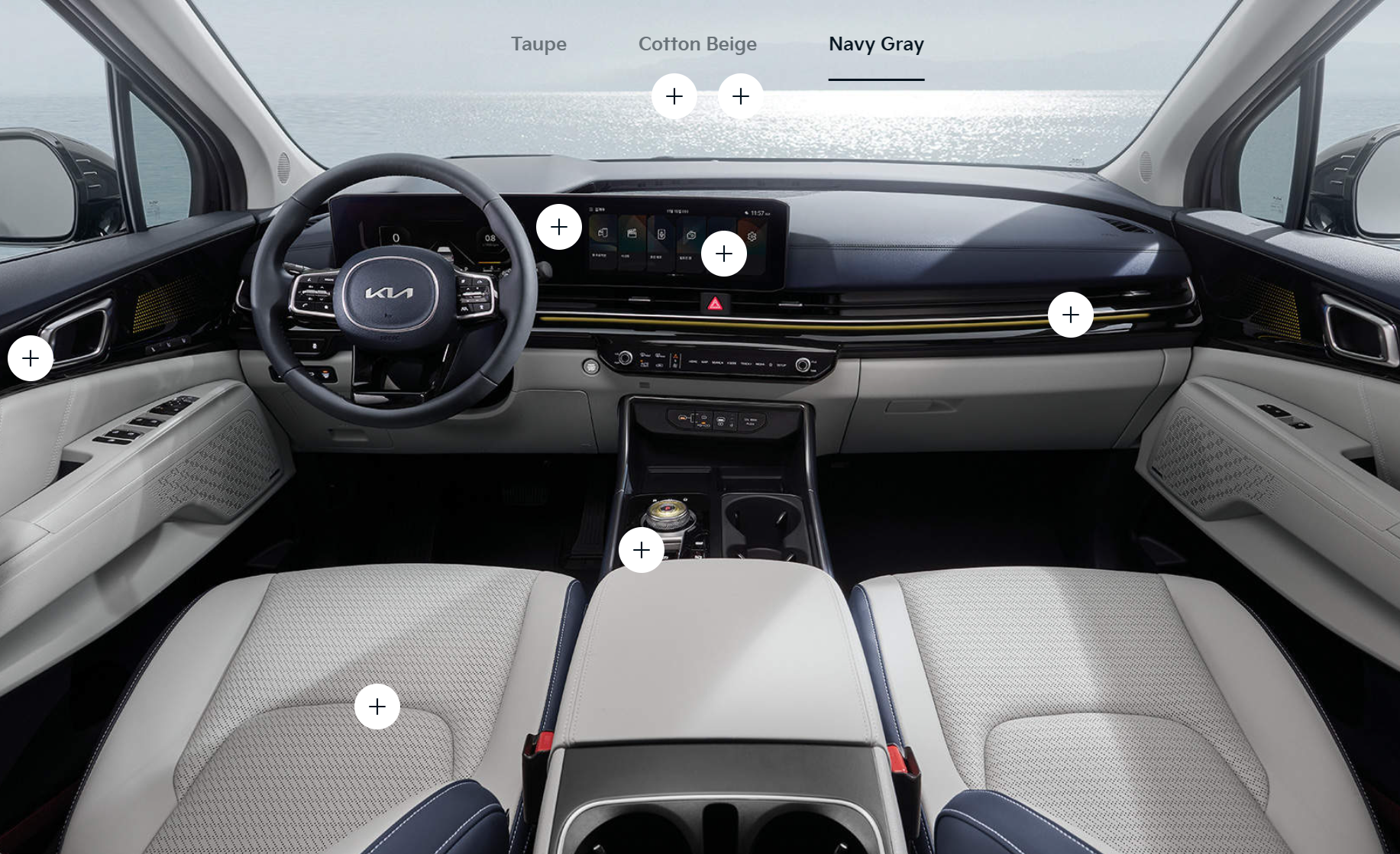 - 다음으로는 실내의 변경입니다. 상기 사진은 제가 기아 홈페이지에서 발췌한 실내의 색상 종류인데요. Taupe, Cotton Beige, Navy Gray로 너무나 이쁜 질감과 색상으로 인테리어 되었습니다.