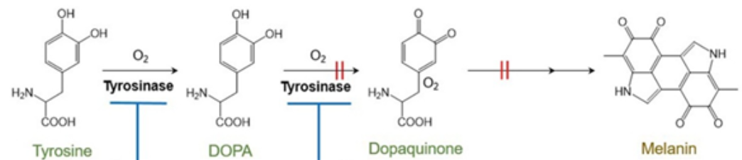 - 글루타치온은 앞서 말씀드린 것처럼 강력한 항산화 작용과 해독 작용을 통해 피부의 건강과 탄력에 큰 도움을 주고, 피부의 미백 효과도 탁월한데 그 이유는 피부가 까맣게 되는 멜라닌 색소의 합성을 저해하기 때문입니다. 글루타치온이 멜라닌 색소의 합성을 저해하는 과정을 한번 자세히 알아보겠습니다.