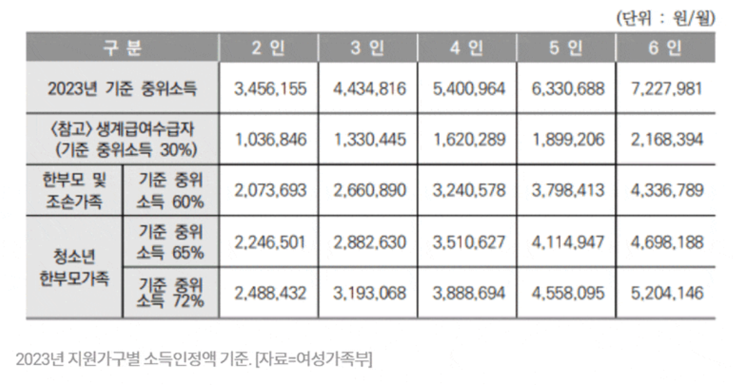 - 한부모 및 조손 가구: 소득인정액이 기준 중위소득의 60% 이하