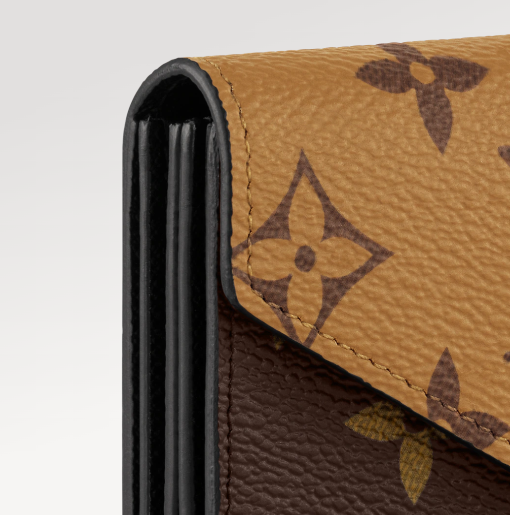 - 오늘 소개해 드릴 루이비통 방돔 카드 홀더 역시 루이비통만의 LV 로고와 꽃, 별 문양 등의 모노그램 패턴이 돋보이는 지갑인데요. 플랩 부분을 보면 색상이 다른데 모노그램 리버스 캔버스 소재를 사용하여 서로 다른 배색으로 더욱 매력을 더한 지갑입니다. 골드 색상의 프레스 스터드형 잠금장치로 디자인되었고요. 카드와 개인 소지품을 보관할 수 있는 다섯 개의 거싯으로 실용성을 더했습니다.