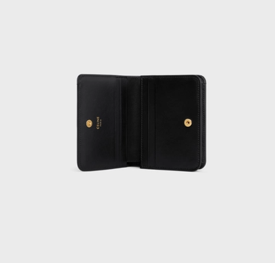 - 오늘 소개해 드릴 제품은 샤이니 카프스킨 콤팩트 지갑인데요. 명칭에서 나와있듯이 상당히 콤팩트하고 실용적이면서도 세련된 지갑으로 안감이 카프스킨으로 되어 있습니다. 블랙에 골드는 진리라고 하죠? 전체적으로 블랙 컬러로 시크하면서도 세련된 디자인에 트리옹프 금장 로고로 피니쉬 하면서 셀린느만의 매력을 가지고 있는 지갑입니다. 내부에는 지퍼로 된 동전 포켓 1개, 카드 슬롯 5개, 노트 포켓 1개, 플랫 포켓 1개로 구성되어 있어 작지만 실용적인 지갑입니다.