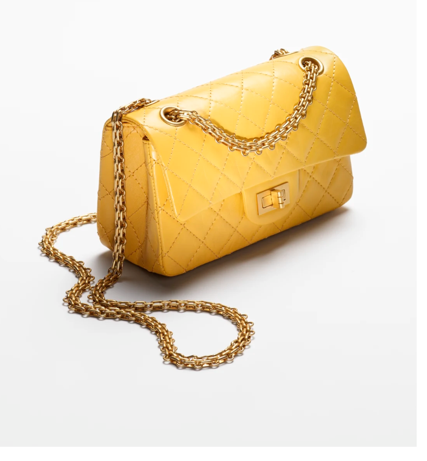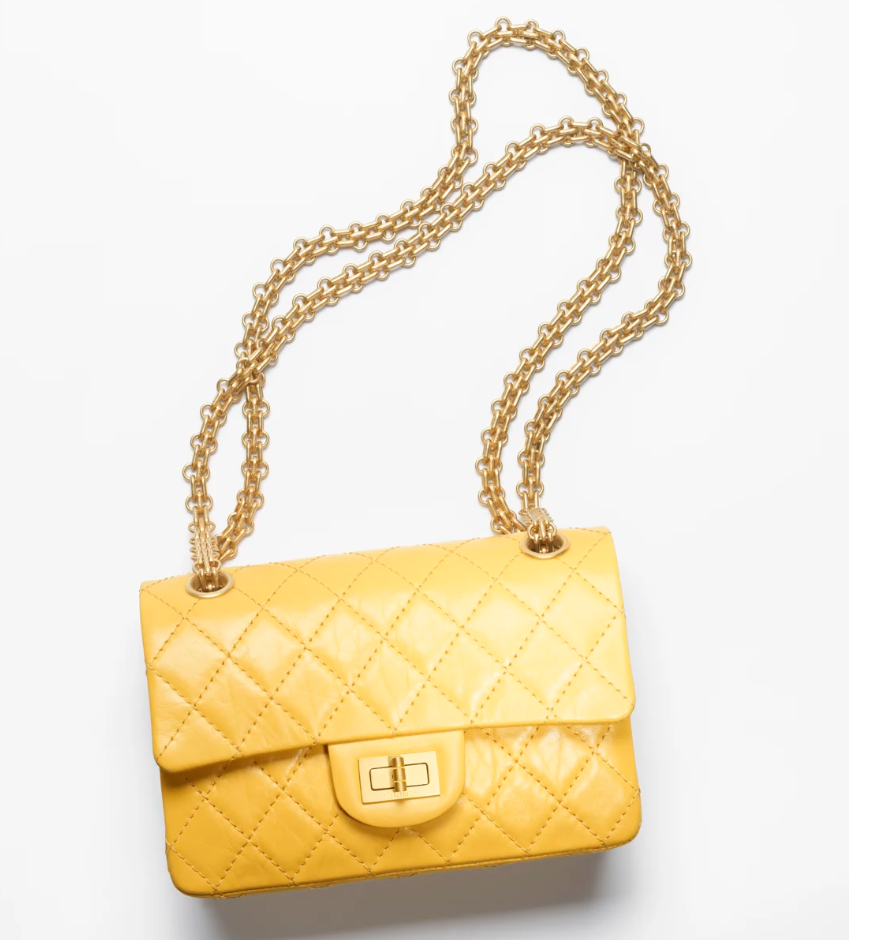 - 마지막으로 살펴볼 제품은 샤넬의 2.55 미니 핸드백입니다. 저는 처음에 이 가방 실물을 보고 옐로우 컬러가 이렇게나 이쁠 수도 있구나 감탄을 했던 제품인데요. 실제로 보면 그냥 화사한 느낌만 드는 것이 아니라 화사한 느낌에 고급스러운 느낌이 합쳐진 듯한 정말 오묘하고 럭셔리한 느낌의 가방이라고 할 수 있습니다.