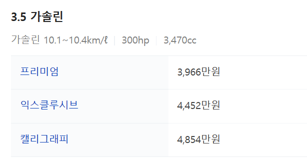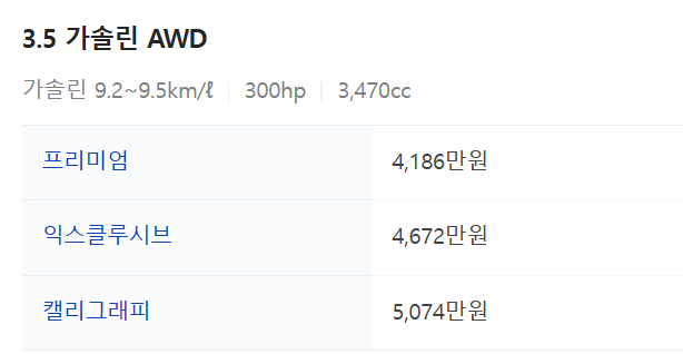 - 마지막으로 2023 그랜저 가격에 대해서 알아보겠습니다. 그랜저는 2.5 가솔린, 3.5 가솔린, 3.5 가솔린 AWD, 3.5 LPG로 나눌 수 있습니다. 각각의 등급별 트림의 가격은 아래와 같습니다.