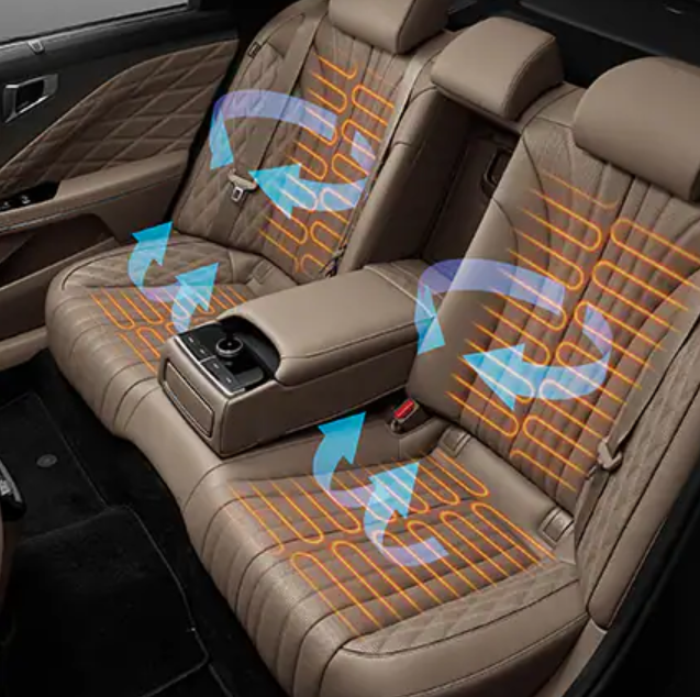 - 뒷좌석에는 3존 공조 시스템으로 실내 온도를 개별 제어할 수 있으며 뒷좌석에도 열선과 통풍 시트가 설계되어 있어 3단까지 조절이 가능합니다. 뒷좌석 센터에 위치한 다기능 센터 암레스트는 슬라이딩 컵홀더, 충전용 USB 단자, 미디어 리모트 컨트롤 기능이 적용되어 있습니다.