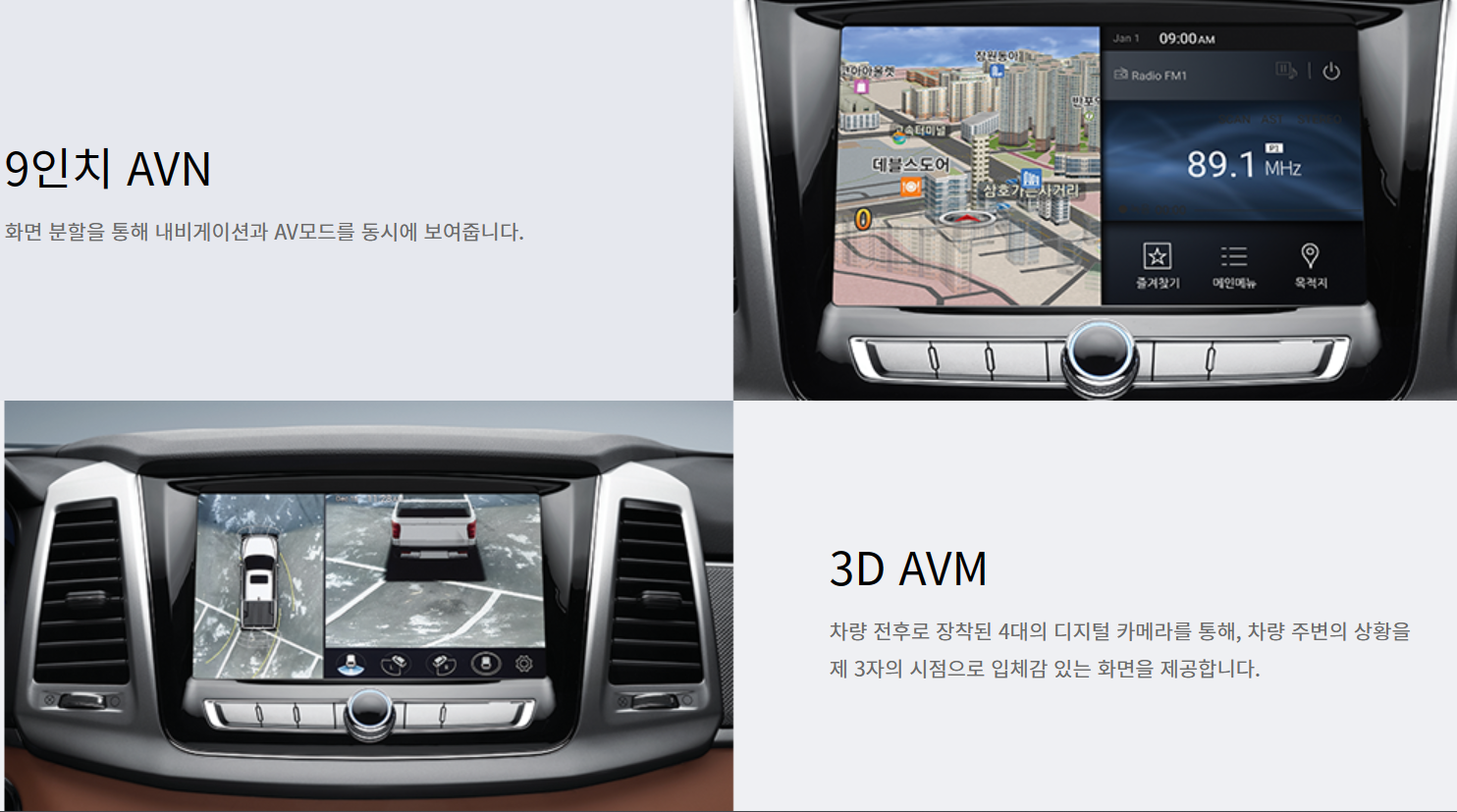 - 렉스턴 스포츠 칸의 실내를 보는 사람들이 모두 공통적으로 하는 말이 픽업트럭인데도 불구하고 너무 세련되고 고급스러운 느낌이 난다는 것입니다. 실제로 픽업트럭이라는 말이 무색할만큼 실내 곳곳에 최고급 소재를 적용하여 고급강을 강화하고 탑승객을 배려한 세심한 편의사양의 적용으로 프리미엄 인테리어를 완성시켰습니다.