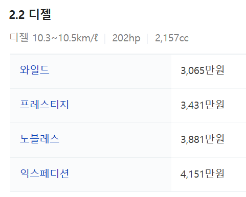 - 2023 렉스턴 스포츠 칸은 2.2 디젤과 2.2 디젤 4WD로 나눌 수 있으며 각각은 다시 와일드, 프레스티지, 노블레스, 익스페디션으로 나누어집니다. 각 등급별 트림의 자세한 가격은 아래와 같습니다.