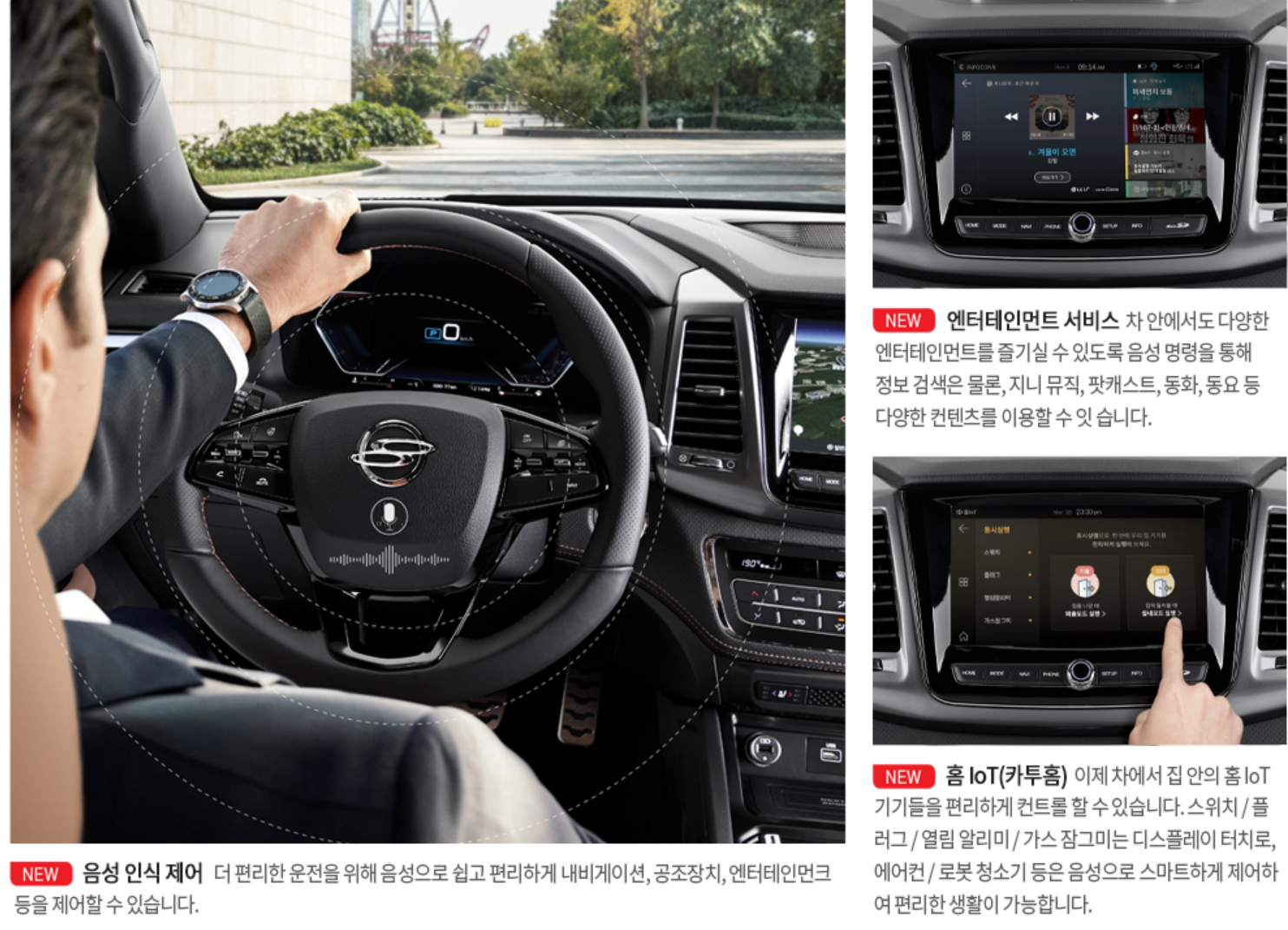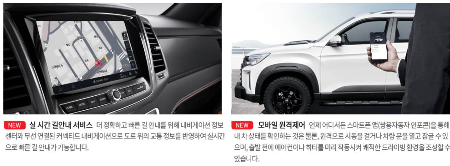 - 렉스턴 칸은 새롭게 적용된 커넥티드 카 서비스 인포콘을 통한 최적의 인포테인먼트 환경으로 운전자가 편하게 운전할 수 있도록 도와줍니다.