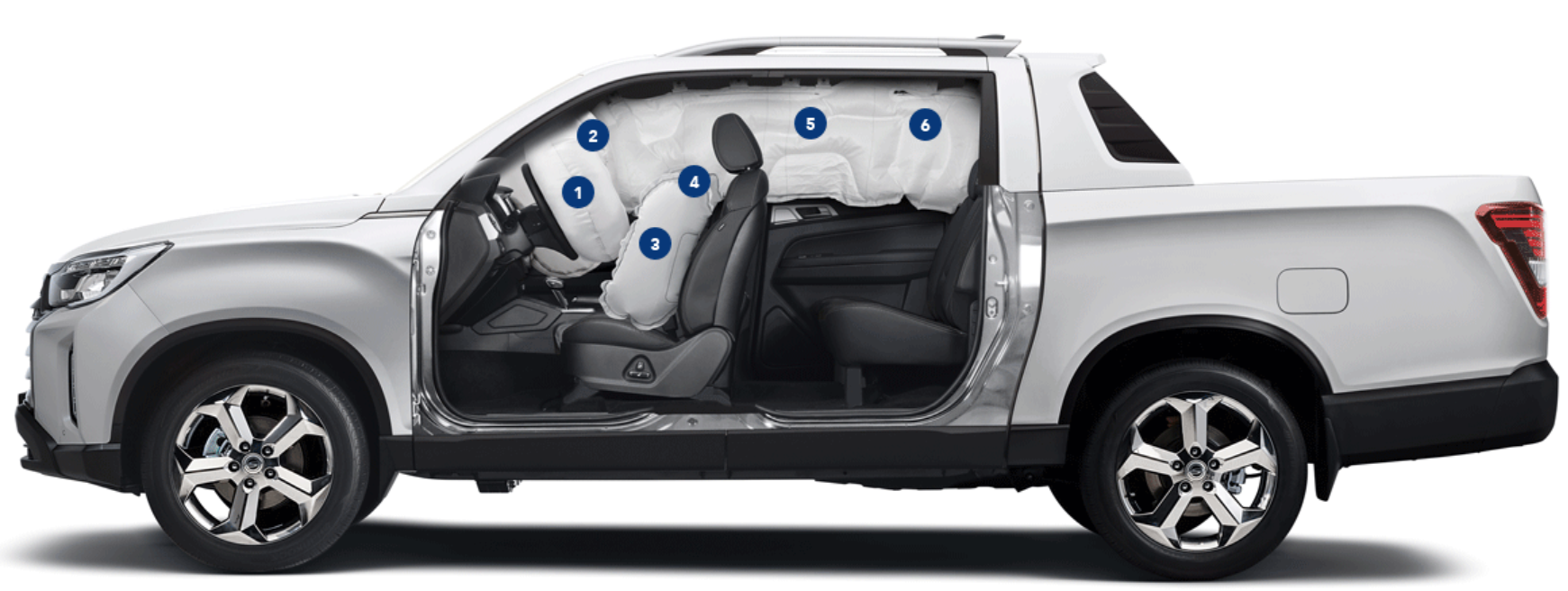 - 에어백은 6 에어백 시스템으로 국내 SUV에 최초로 적용되었으며 실내 전체를 감싸는 기능으로 사고 시 운전자와 동승자를 최대한 보호해줍니다.