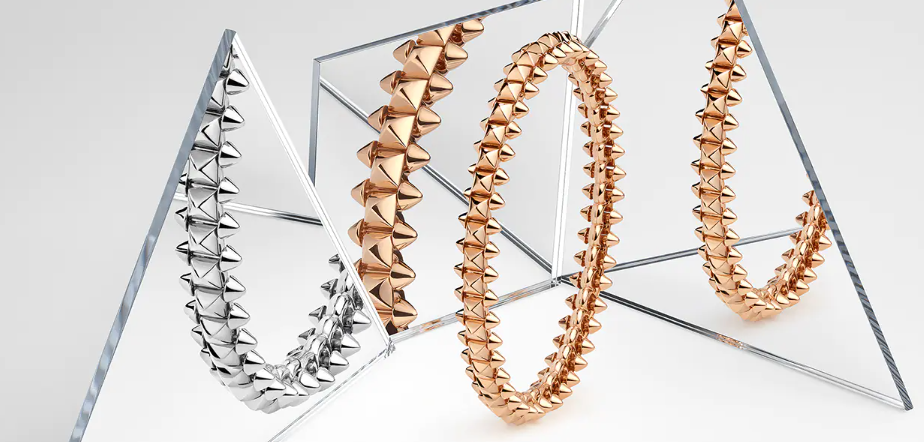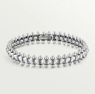 - 클래쉬 더 까르띠에는 사진에서 보시는 것처럼 징 스터드가 특징이라고 할 수 있는데요. 내부는 또 부드러운 라운드 모양으로 둥글둥글한 사각 쉐입이 반복적으로 배치되어 있습니다. 즉 뾰족함과 둥그스름한 모양이 서로 조화를 이루고 있는 모습이라고 할 수 있는데요. 이는 마치 강인함 속에 부드러움을 상징하는 것과 같습니다. 실제 까르띠에에서 애초에 클래쉬 더 까르띠에를 기획할 때 서로 상반된 이미지가 하나로 조합되면서 조화를 이루는 것을 추구했기 때문에 오묘하고 독특한 조화의 매력을 느낄 수 있는 팔찌입니다.