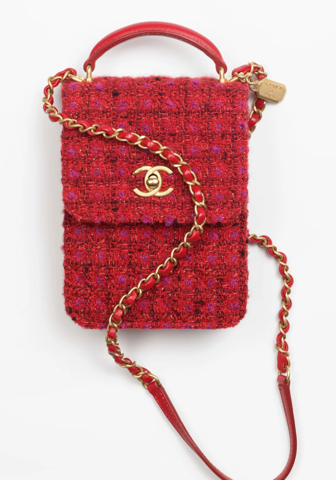 - 다음으로는 핸들 장식의 미니 플랩백입니다. 가을, 겨울에 알맞은 다양한 색상과 재질로 출시되었는데요. 우선 가장 왼쪽에 빨간 플랩백을 보면 날이 쌀쌀해지거나 크리스마스 같이 한겨울에 잘 어울릴만한 색상으로 출시되었습니다. 역시나 울 트위드 제품으로 상당히 감촉이 부드러운 플랩백이고요. 색상은 레드, 퍼플, 블랙이 있습니다.