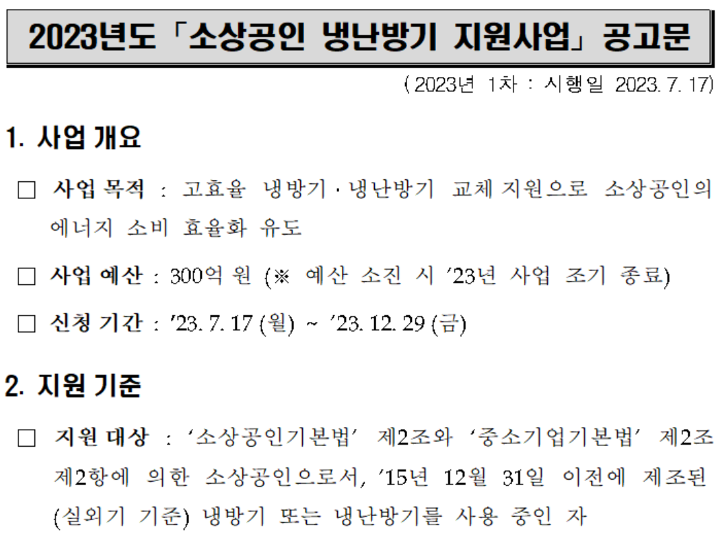 - 상기에 나온 대로 소상공인 냉난방기 지원사업은 오래된 에어컨 등을 교체할 때 지원금을 주는 사업입니다. 2023년 7월부터 시행하는 따끈따끈한 사업으로 노후된 에어컨이 있다면 적극적으로 신청해 볼 만한 지원 사업입니다.