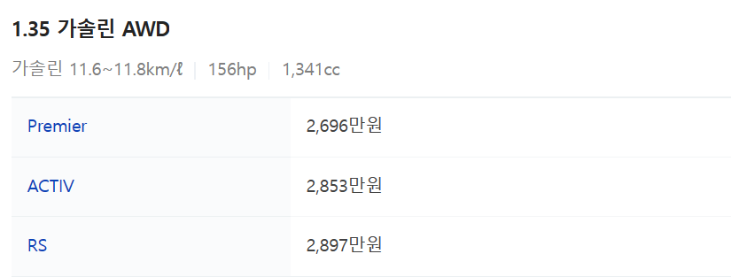 - 트레일블레이저 가격은 1.35 가솔린인지 1.35 가솔린 AWD인지에 따라 가격이 다릅니다. 한 눈에 보시기 편리하도록 아래와 같이 가격을 정리했습니다.