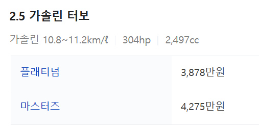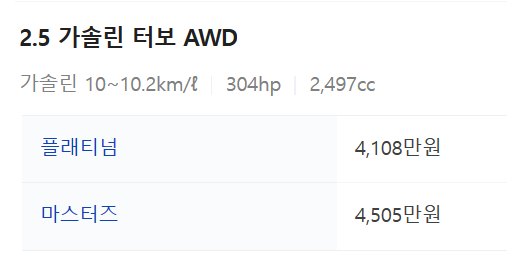 - 2023 스팅어는 2.5 가솔린 터보 / 2.5 가솔린 터보 AWD / 3.3 가솔린 터보 / 3.3 가솔린 터보 AWD로 나눌 수 있습니다. 각 등급별 트림의 가격은 아래와 같습니다.