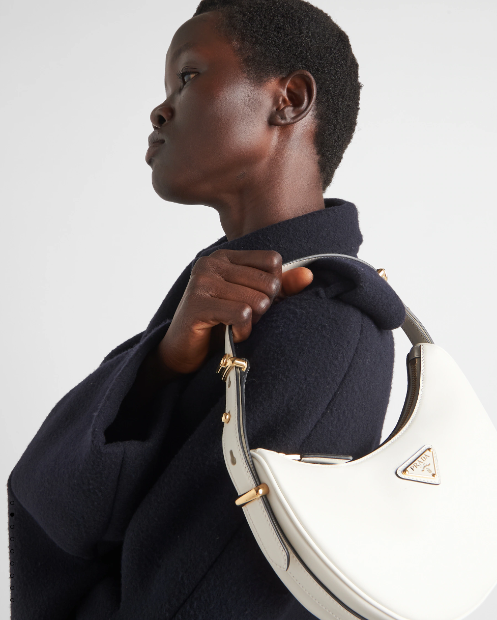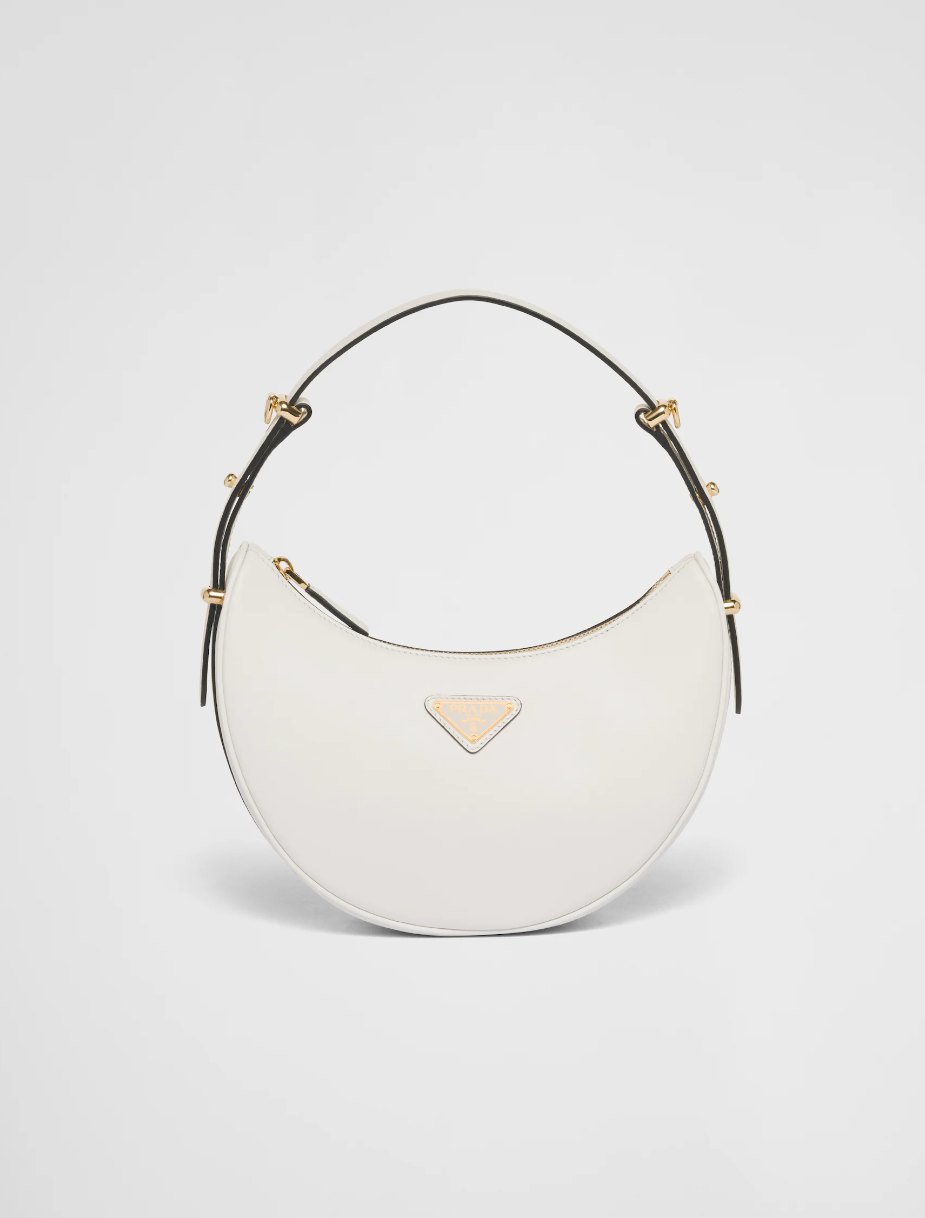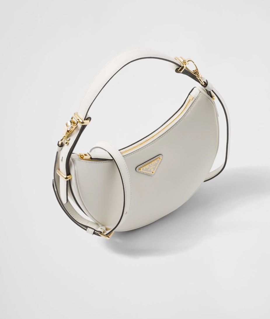 - 마지막으로 소개해 드릴 제품은 프라다 아르케 가죽 숄더백입니다. 프라다는 고급소재와 혁신적인 디자인, 다채로운 컬러감으로 유명한데요. 이번에 새로 나온 프라다 아르케 가죽 숄더백 역시 깔끔하고 단정한 화이트톤에 반달모양의 특이한 디자인으로 시선을 한눈에 사로잡습니다.