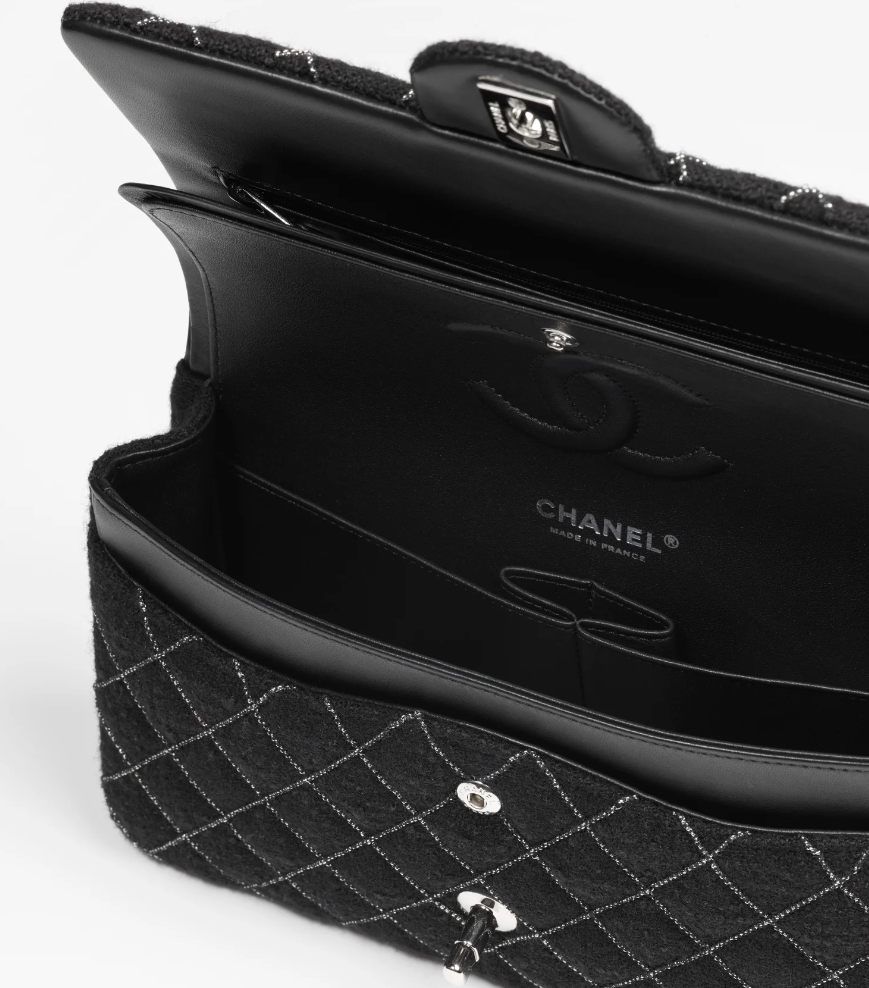 - 샤넬의 플랩백 라인 자체가 워낙 샤넬에서 아이코닉하고 간결하고 우아한 디자인으로 사랑받고 있기 때문에 신제품 역시 인기가 상당할 것으로 예상됩니다. 외부는 울 트위드로 우아하고 따뜻한 이미지라면 내부는 고급 블랙 가죽의 매끈한 소재로 럭셔리하고 시크한 매력을 뽐내는 플랩백입니다. 개인 소지품을 넣기에 충분한 공간이며 고풍스럽지만 시크하고 럭셔리한 느낌을 자아내는 핸드백입니다.