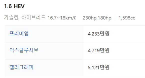 - 2023 신형 그랜저 하이브리드는 프리미엄/익스클루시브/캘리그래피로 나눌 수 있습니다. 각각의 등급별 트림에 자세한 가격은 아래와 같습니다.