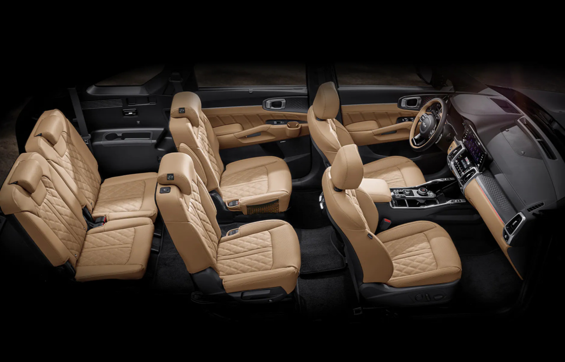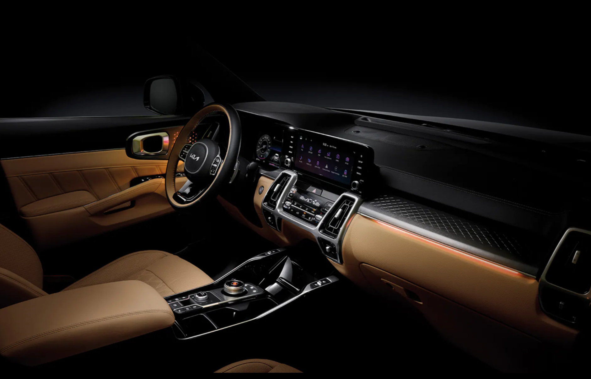 - 쏘렌토의 실내 디자인은 기능적인 감성을 잘 나타내주고 있습니다. 퀄링 가죽 시트로 인해 세련되고 고급스러운 차량의 내부 이미지를 만들면서도 운전자의 편의에 맞게 알짜 있는 기능적인 면을 모두 갖추고 있습니다. 12.3 인치 계기판과 10.25 인치 디스플레이는 넓직한 모니터처럼 직관적으로 볼 수 있게 설계되어 있고, 실내 디자인을 더욱 고급져 보이게 하는 역할을 하고 있습니다. 상하를 분리한 듀얼 에어 벤트는 외관의 디자인과 조화롭게 어울러져 감성을 더해줍니다. 수납공간과 편의 사항들은 당연히 풍부하게 들어가 있으며 기어노브 역시 다이얼 방식으로 고급스러운 이미지를 더해주고 있습니다.