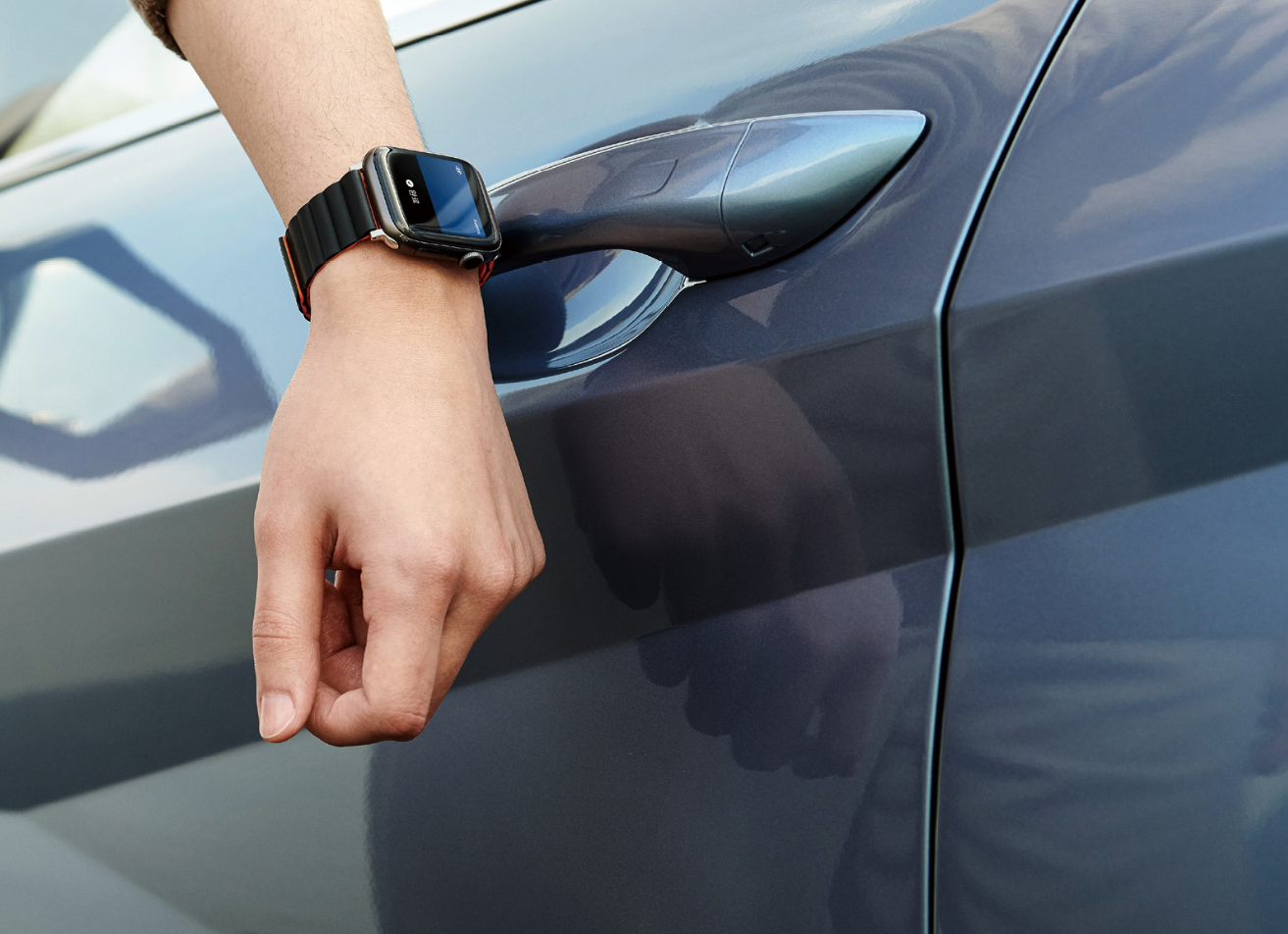 - 아반떼 하이브리드 버전에는 각종 최첨단 편의 사양들이 설계 되어 있는데요. 우선 사진과 같이 차키가 따로 없어도 아이폰이나 애플워치, 안드로이드 스마트폰(삼성 갤럭시) 등으로 도어를 잠금 해체하거나 시동을 걸 수 있습니다. 또한 사용 권한을 3명까지로 늘릴 수도 있습니다.