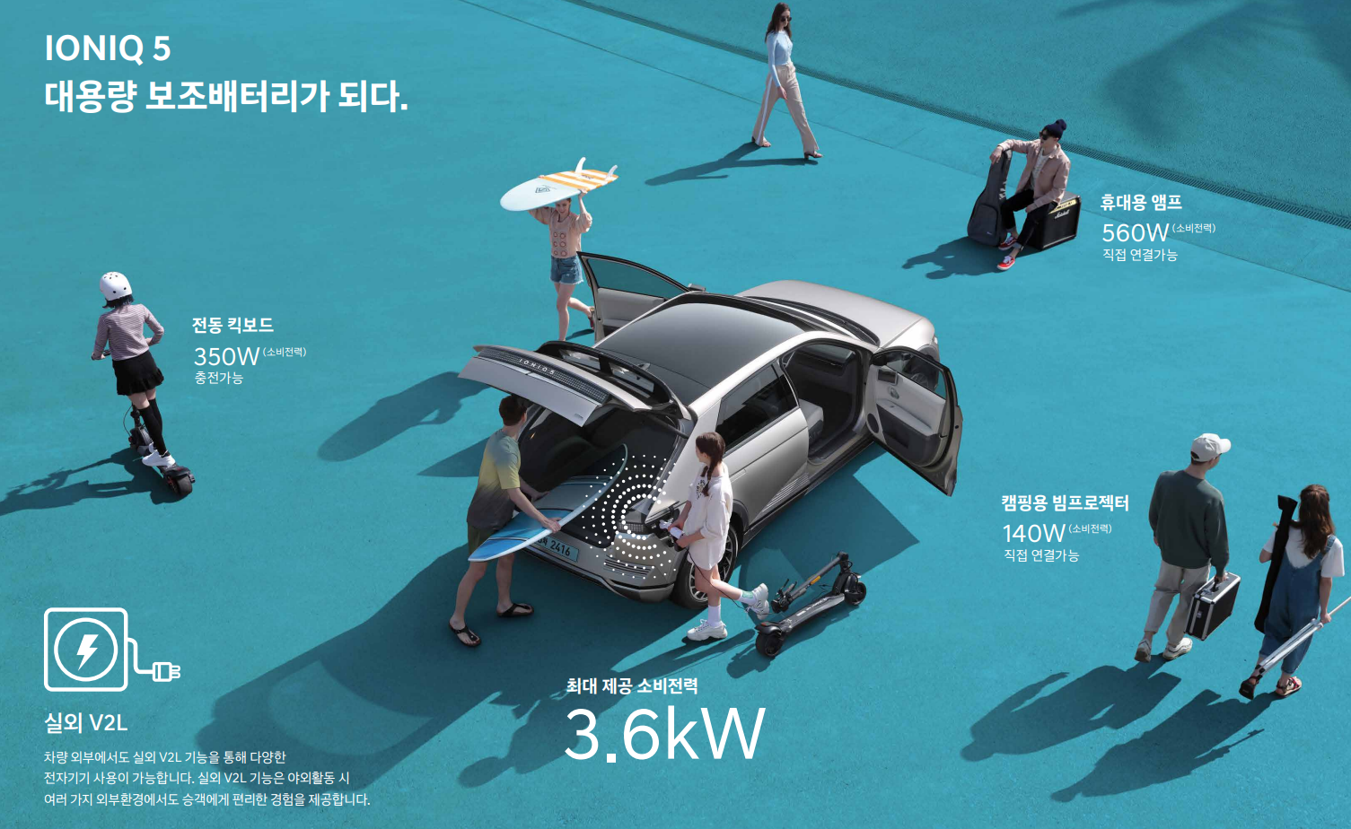- 아마 V2L 기능에 대해서는 많은 분들이 들어보셨을텐데요. 아이오닉 5의 가장 큰 장점 중의 하나라고 할 수 있는 V2L 기능은 전기차에 탑재된 배터리의 전력을 외부로 끌어다 쓸 수 있는 기능입니다. 한동안 우리를 힘들게 했던 코로나 사태 때 차박이 열풍을 일으키면서 해당 기술은 사람들에게 굉장히 각광받았습니다. 용량 측면에서 봤을 때, 전열 기기를 포함하여 어지간한 고용량 전자 기기는 3대를 동시에 충전할 수 있는 양이기 때문에 캠핑용이나 기타 전자기기의 충전 시 활용도가 대단히 높다고 할 수 있습니다.