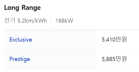 - 연비 : 복합 4.7 ~ 5.2km/kWh 도심 5.3 ~ 5.9, 고속 4.2 ~ 4.5