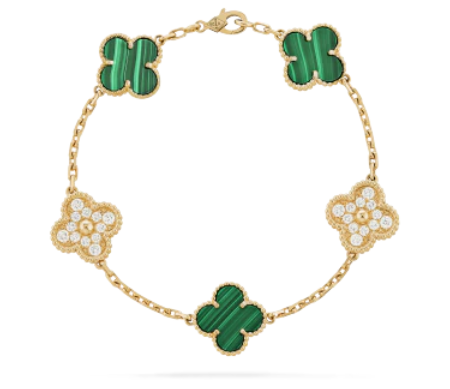 - 두 번째로 소개해 드릴 브랜드는 반클리프 앤 아펠입니다. 만약 내가 평소에 자연친화적이고 서정적인 디자인을 좋아한다고 하시면 무조건 이 브랜드를 선택하셔야 하는데요. 반클리프 앤 아펠은 고유의 자연 친화적 디자인과 서정적이고 세련된 디자인으로 유명하기 때문입니다. 가장 대표적인 라인업으로는 네 잎클로버 모양을 하고 있는 알함브라가 유명합니다. 이건 팔찌에도 똑같이 적용이 되는데요. 네잎클로버 5개가 팔목을 감싸고 있는 알함브라는 반클리프 앤 아펠의 대표 모델이라고도 할 수 있습니다. 그렇다고 기타 라인업이 인기가 없는 것은 아니고 모든 라인업이 세계적으로 유명한 만큼 각기 다른 매력을 가지고 있습니다.