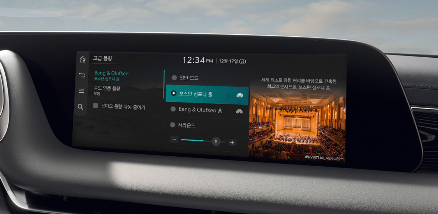 - 뱅인올룹슨 프리미어 3D 사운드 시스템은 헤드레스트와 헤드라이닝, 전동 팝업 트위터 등을 포함해 총 23개의 스피커가 풍부하고 섬세한 사운드를 제공해 줍니다. 가상의 3D 서라운드 음향은 실제 콘서트장에 간 것과 같은 현장감 넘치는 사운드를 제공해 줍니다.