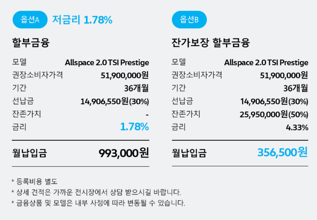 - 폭스바겐뿐만 아니라 외제차들은 프로모션을 자주 하기 때문에 프로모션 기간에 맞춰 구매를 하는 것이 유리합니다. 이번에 티구안 올스페이스 역시 폭스바겐에서 상기와 같이 할인 정책을 하고 있는데요. 저금리 할부에 보증 연장, 블랙박스 장착, 사고 수리 토탈 케어 서비스까지 여러 가지 혜택이 있으니, 폭스바겐 티구안 올스페이스에 관심이 있으신 분들이라면 한 번 자세히 둘러보시면 좋을 것 같습니다.