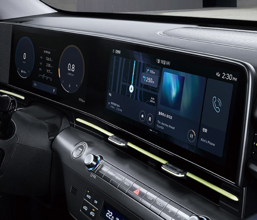 - 파노라믹 디스플레이로 클러스터와 내비게이션 간 일체감 있는 그래픽 테마를 구현하고 자연어 기반 음성 인식, 미디어 스트리밍, 실시간 길 안내 등의 다양한 콘텐츠를 제공합니다.