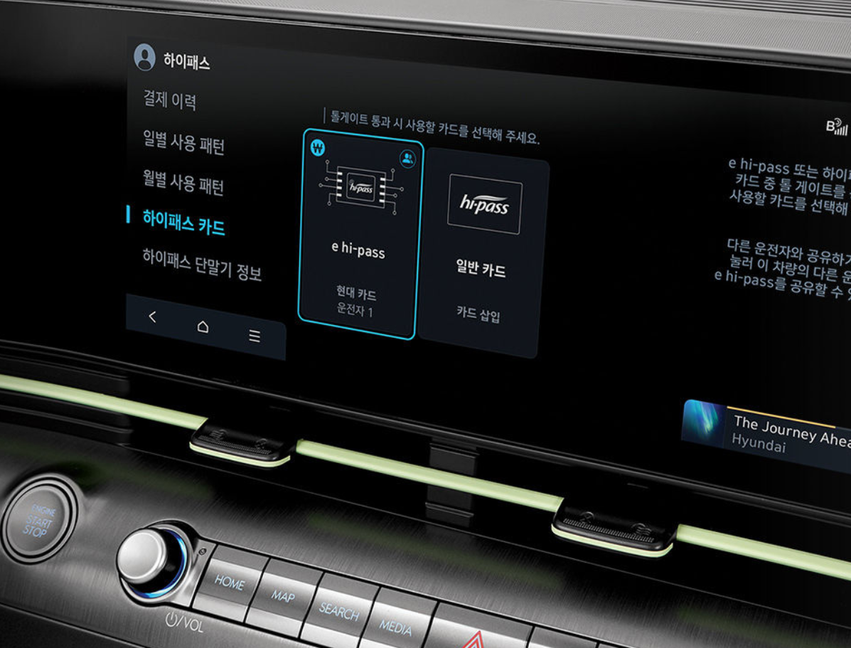 - 현대 카페이와 연동하여 e hi-pass 신청 및 관리가 가능하고 차량에서 실물 카드 없이 유료 도로의 통행료 결제가 가능합니다.