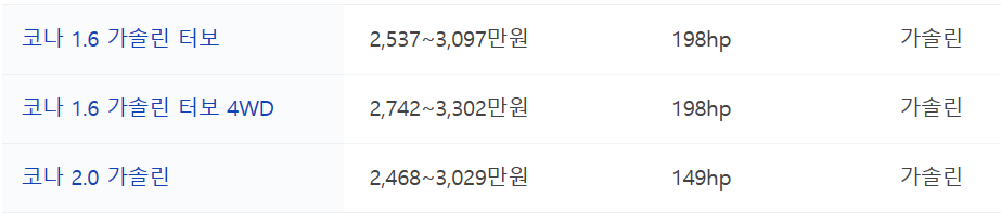 - 현대 디 올 뉴 코나의 등급별 트림은 코나 1.6 가솔린 터보 / 코나 1.6 가솔린 터보 4WD / 코나 2.0 가솔린으로 나눌 수 있습니다. 각각의 등급별 트림의 가격은 아래와 같습니다.