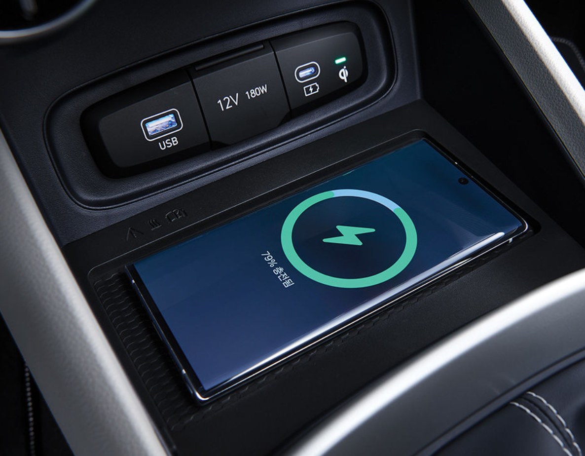 - 운전석과 보조석 사이의 센터콘솔에 스마트폰 무선 충전이 가능한 패널이 설계되어 있습니다. 따라서 별도의 케이블 없이 무선으로 스마트폰의 충전이 가능하며 스마트폰 방치 시 알림 기능으로 편의성도 높였습니다.