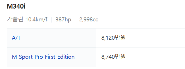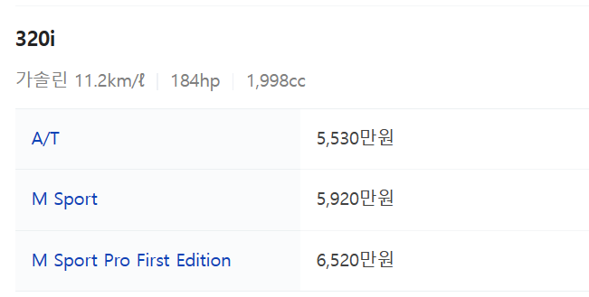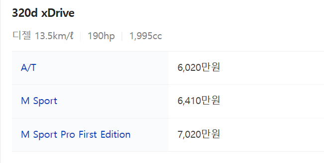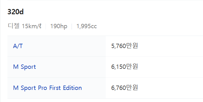 - BMW 3 시리즈는 등급별 트림을 320i, 320d, 320d xDrive, M340i로 나눌 수 있습니다. 자세한 가격은 아래와 같습니다.