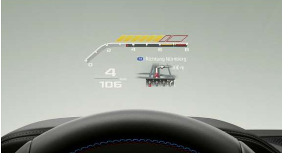 - M 특유의 디스플레이를 포함한 풀 컬러의 헤드업 디스플레이를 보여주어 운전자가 운전에만 집중할 수 있도록 도와줍니다. 화면에는 현재 속도, 내비게이션 정보, 도로의 최고 속도 정보, 전화, 엔터테인먼트 리스트 등 다양한 정보가 표시됩니다.